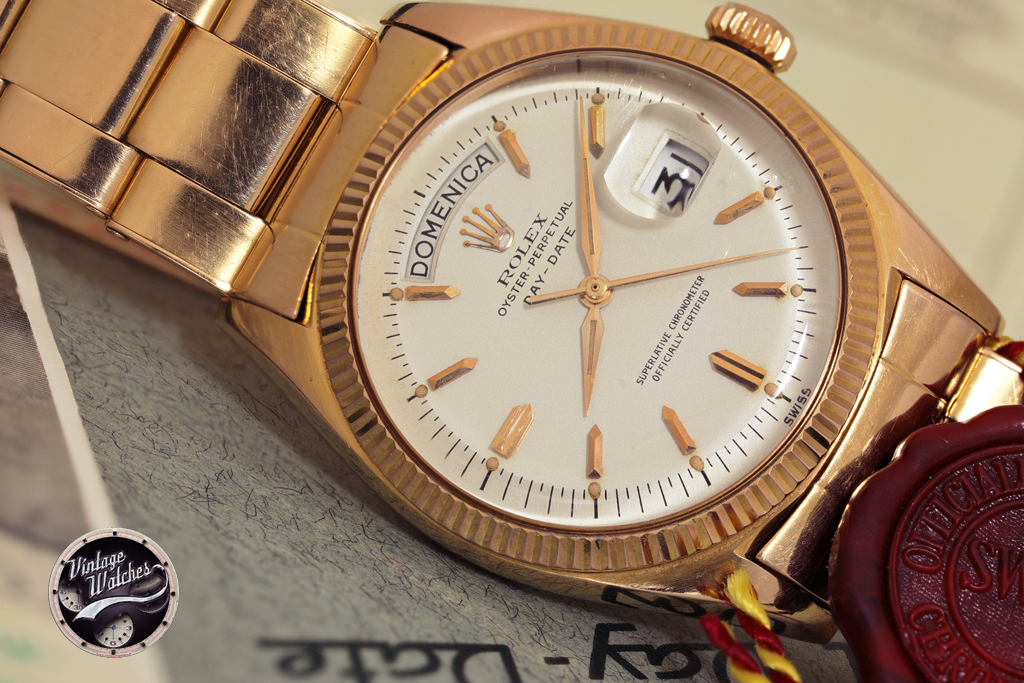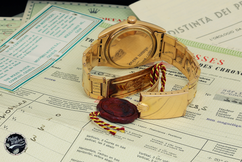 Rolex Daydate ref. 1803 in Rose Gold with elastic Oyster bracelet, Papers and COSC