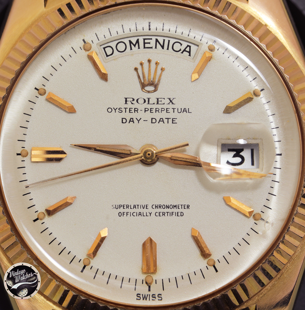 Bezel millerighe legacy of the old references and early Day-Date 1803 models, domed date glass that makes the dial optically different and much more beautiful than the later and flat dial, dial with leaf-shaped hour markers and hands.