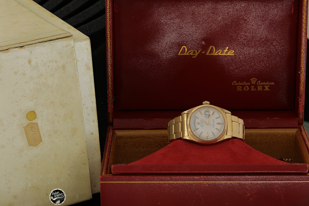 The famous three-link “President” bracelet (from which the watch gets its nickname) is not present, and in its place is a very rare 18K rose gold extendible rivet Oyster bracelet.