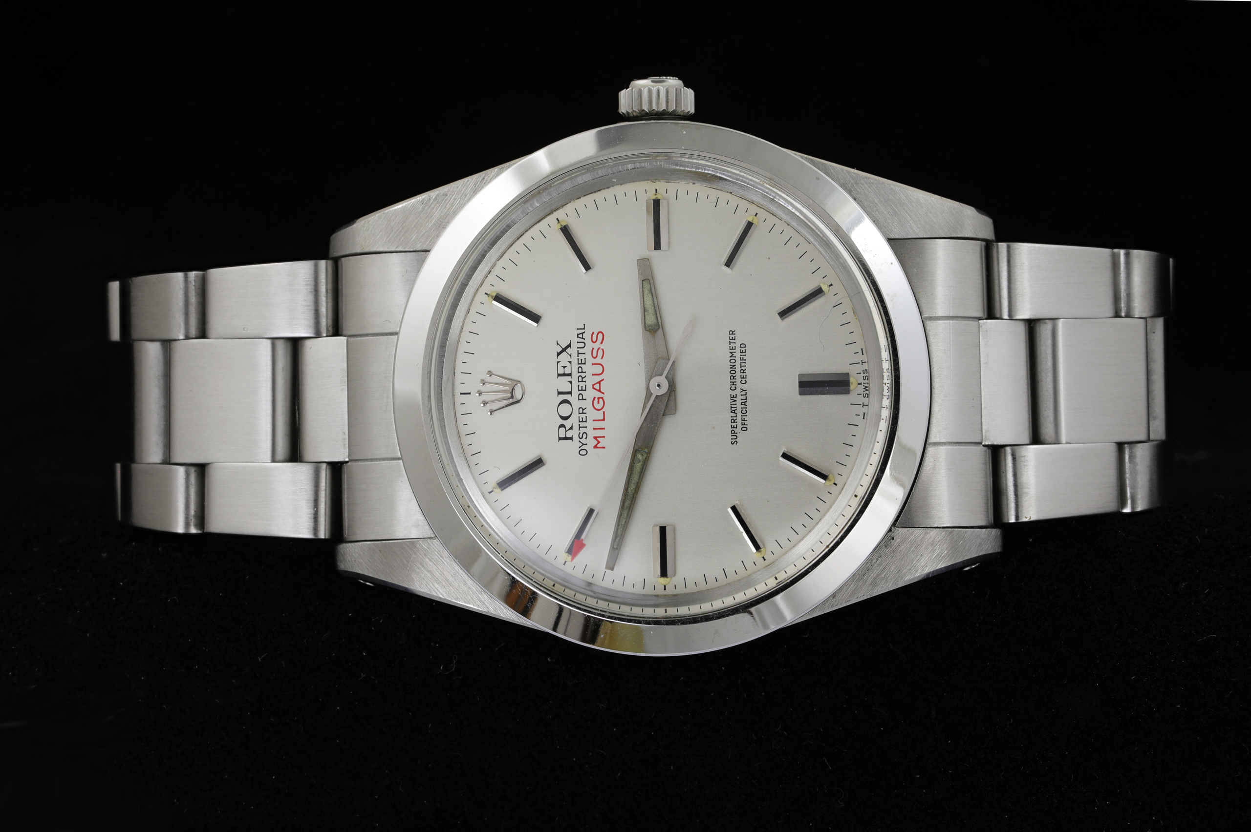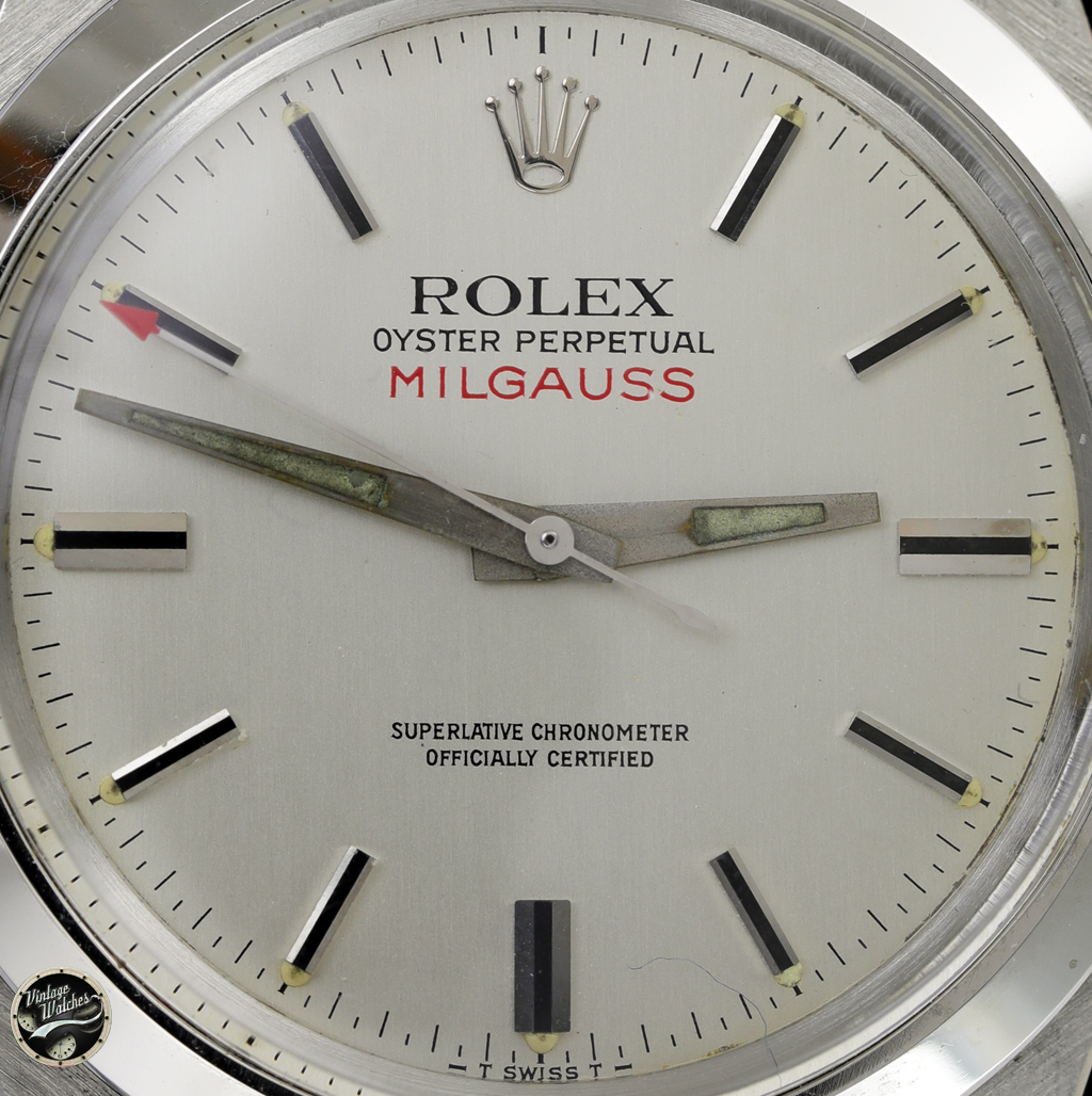 The case diameter was 38mm ,enlarged from the then standard 36mm to accommodate the Faraday anti-magnetic cage that surrounded the movement. The Milgauss 1019 mounted the seconds hand equipped with a unique red arrowhead. None of these hands were ever used on other Rolex models. During these years there were variations in the dials; the early models had Half-Hash indices, that is, the circular seconds scale that divided each second in half. The dials were brushed silver and black with and without luminous material, close seconds scale (Half-Hash), baton hands with the arrowhead seconds hand. Later they became silver and black with seconds not close but placed on the perimeter.