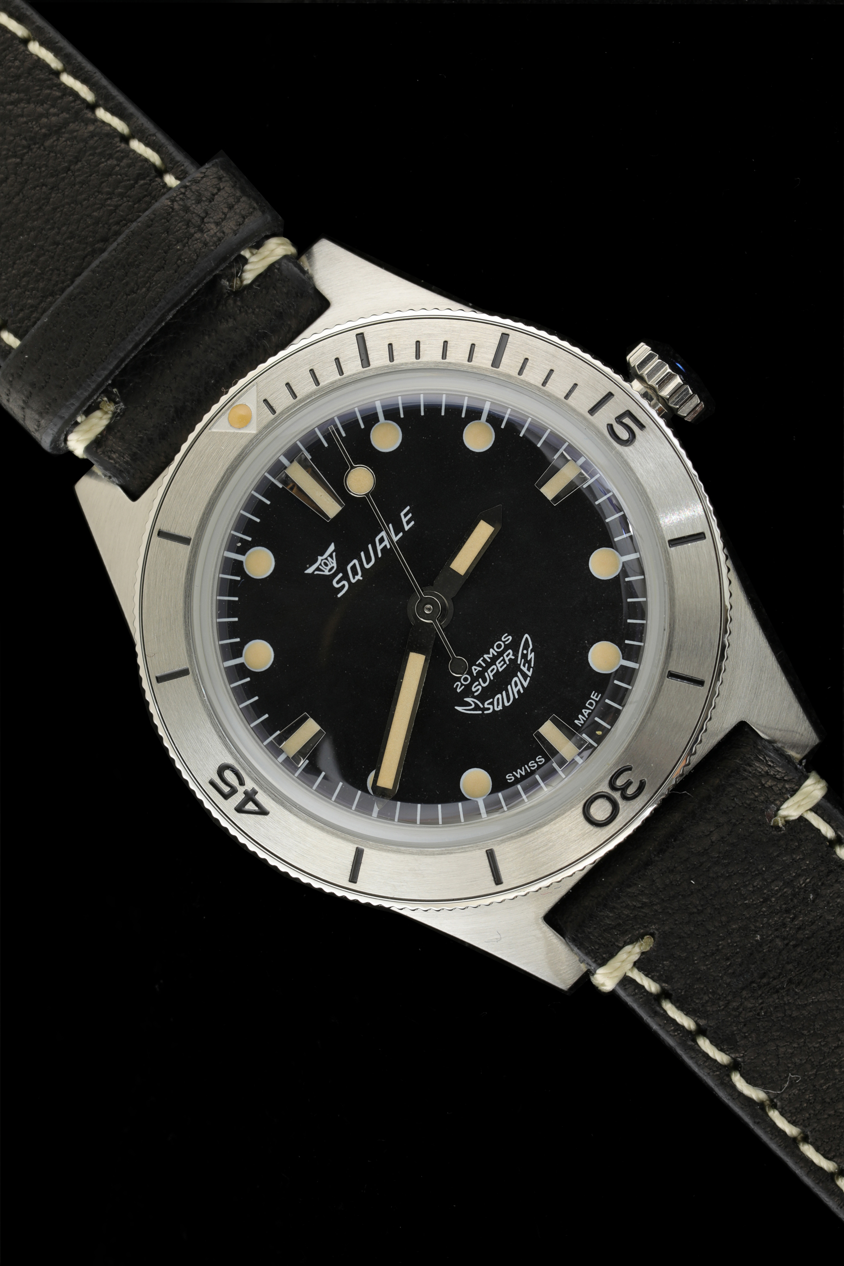 Strap: black leather “Pluto” made in Italy 18mm with Squale steel buckle