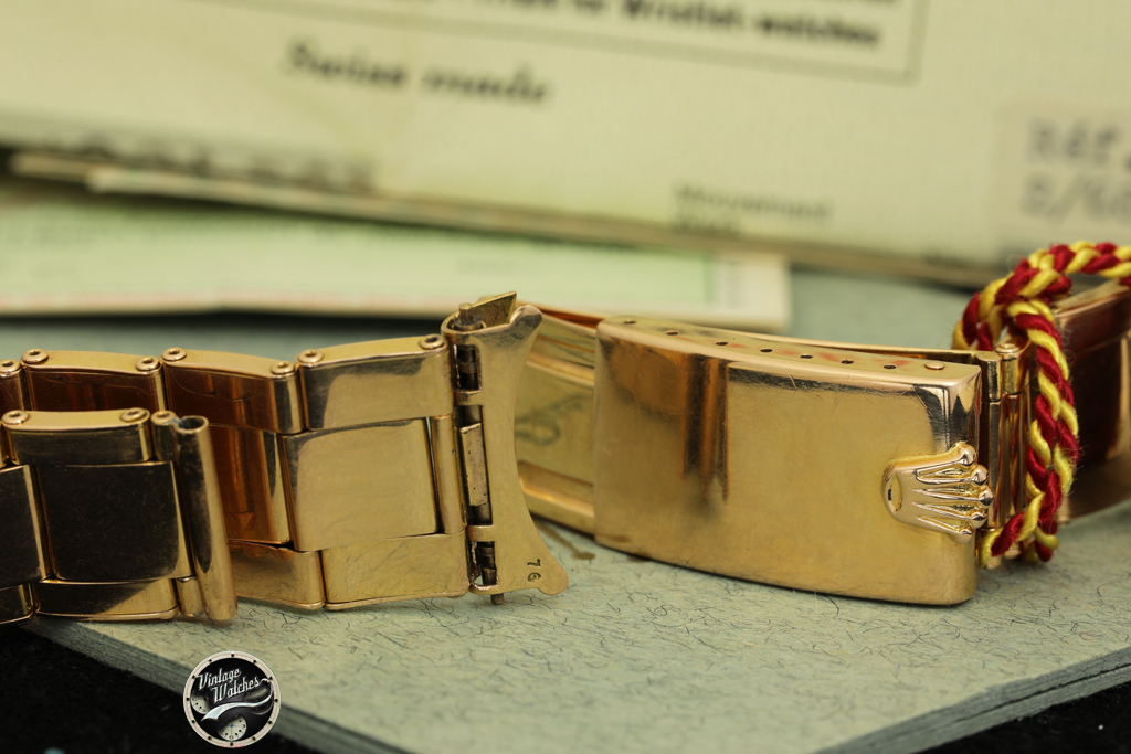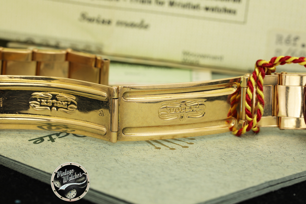 Il famoso braccialetto a tre maglie “President” (da cui l’orologio prende il soprannome) non è presente, e al suo posto c’è un rarissimo bracciale Oyster rivetti in oro rosa estensibile a 18 carati.